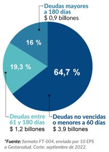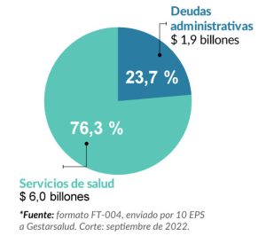 En el análisis realizado con corte a septiembre de 2022 con información de 10 EPS agremiadas a Gestarsalud, reportadas en el Formato FT004, se encontró que el pasivo asciende a $ 7,9 billones, de las cuales el 23,7 por ciento ($ 1,9 billones) corresponde a deudas de carácter administrativo y otro tipo de acreencias y el 76,3 por ciento ($ 6,0 billones) corresponden a conceptos por prestación de servicios, insumos y medicamentos.
