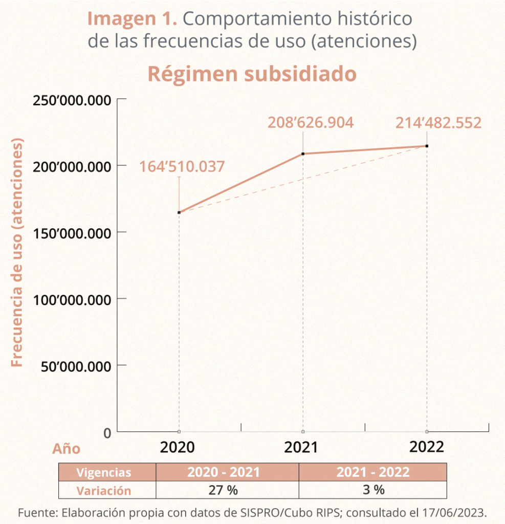 En el régimen subsidiado, donde operan las EPS agremiadas en Gestarsalud, se observa un aumento acelerado en el comportamiento de las frecuencias de uso (atenciones), que se mantuvo incluso después los dos primeros años de pandemia, como puede observarse en la imagen 1, con base en datos del Sistema Integrado de Información de la Protección Social (SISPRO).