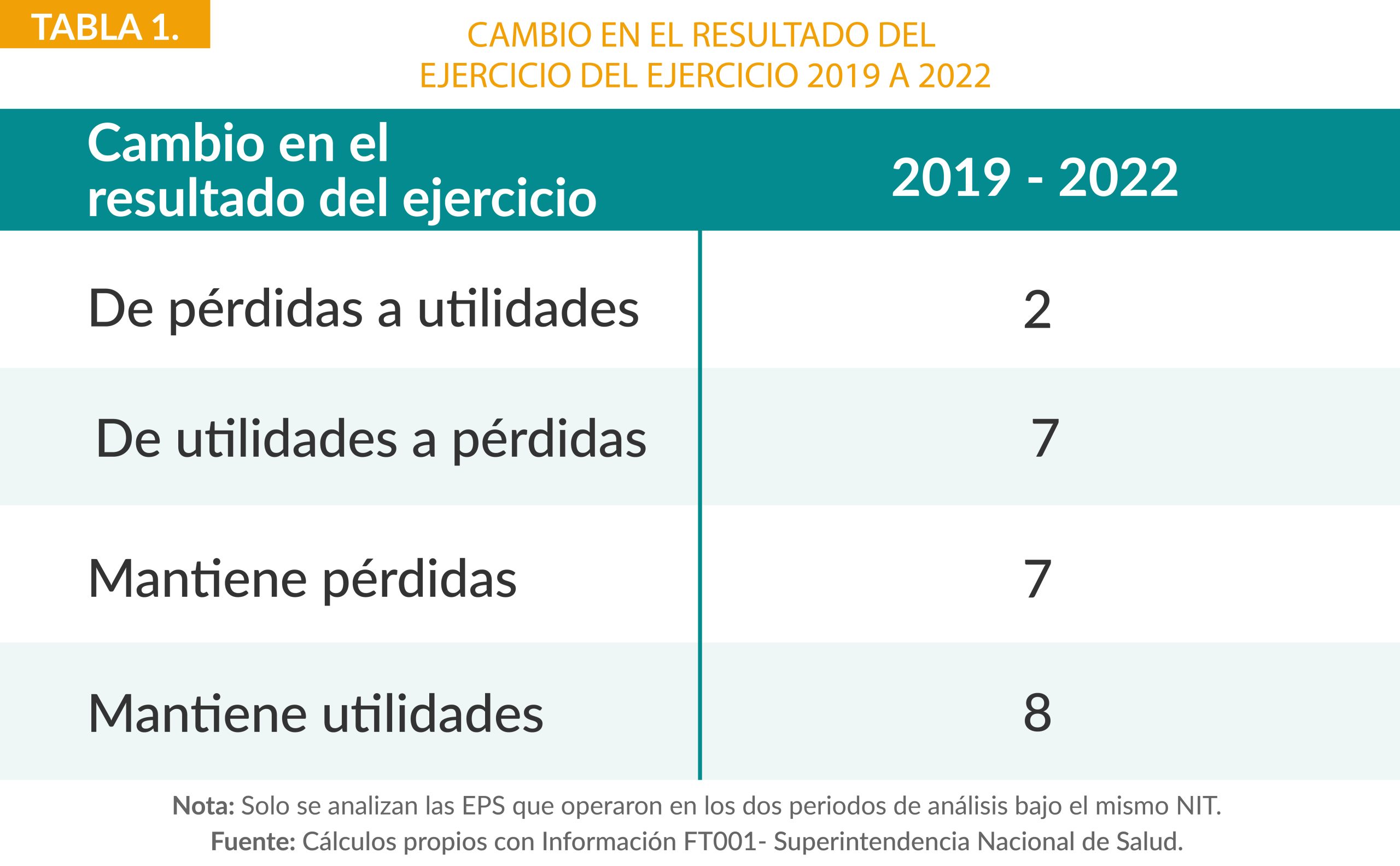 Al realizar un ejercicio comparativo individual por EPS entre 2019 y 2022, se observa que siete EPS pasaron de tener utilidades a tener pérdidas; siete mantuvieron resultados negativos; únicamente dos pasaron de tener pérdidas a reportar utilidades y; ocho mantuvieron utilidades (Tabla 1). Esta situación refleja que las condiciones para las aseguradoras son más complejas en este último tiempo que lo observado en los años previos a la pandemia.