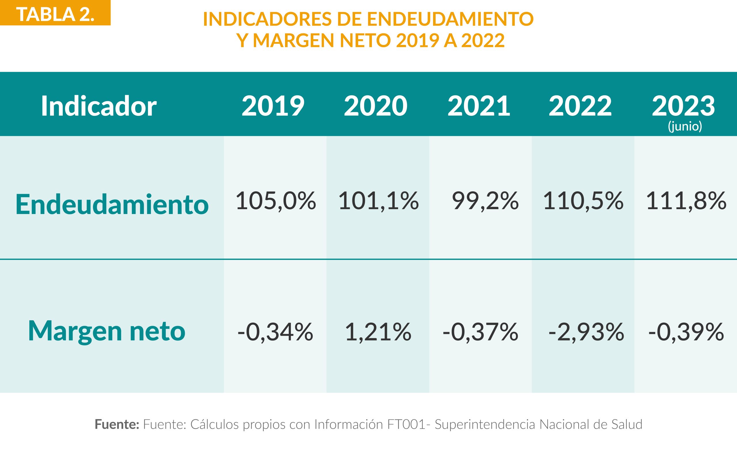 En todos los años, excepto en 2020, se ha observado un índice de endeudamiento superior al 100 %, alcanzando su punto más alto en junio de 2023 con un resultado del 111,8 %. Esto indica que las EPS carecen de la capacidad financiera para pagar la totalidad de sus pasivos. En línea con esta situación, se registra un margen neto negativo en cuatro de los cinco años de análisis, siendo el peor resultado en 2022 con un 2.93 %. Esto implica que las EPS incurren en una pérdida de $0.0293 por cada peso de ingresos recibidos (Tabla 2).