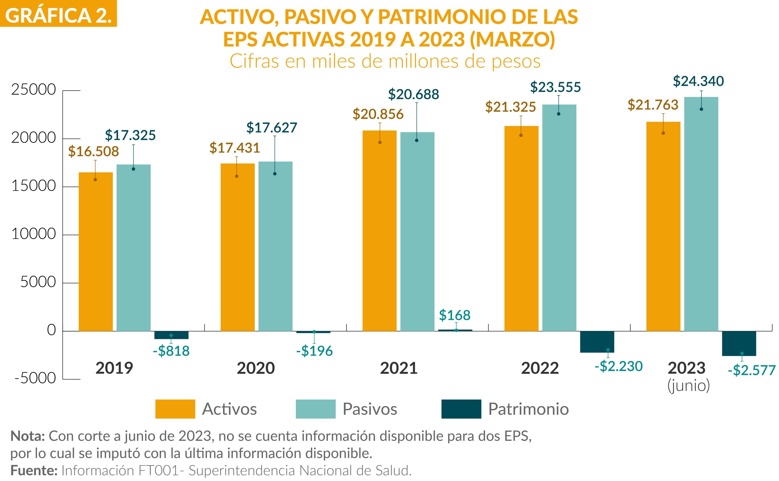 Como se observa en la gráfica anterior, el total de pasivos ha crecido más que el total de los activos de las EPS. En 2021, los pasivos sumaban $ 20.6 billones, en 2022 alcanzaron los $ 23.5 billones y para junio de 2023 alcanzaron ya los $ 24.3 billones; es decir, entre diciembre de 2021 y junio de 2023, los pasivos han crecido un 18 %. Por otro lado, los activos aumentaron únicamente un 4 %, pasando de $ 20.8 billones en diciembre de 2021 a $ 21.7 billones en junio de 2023.