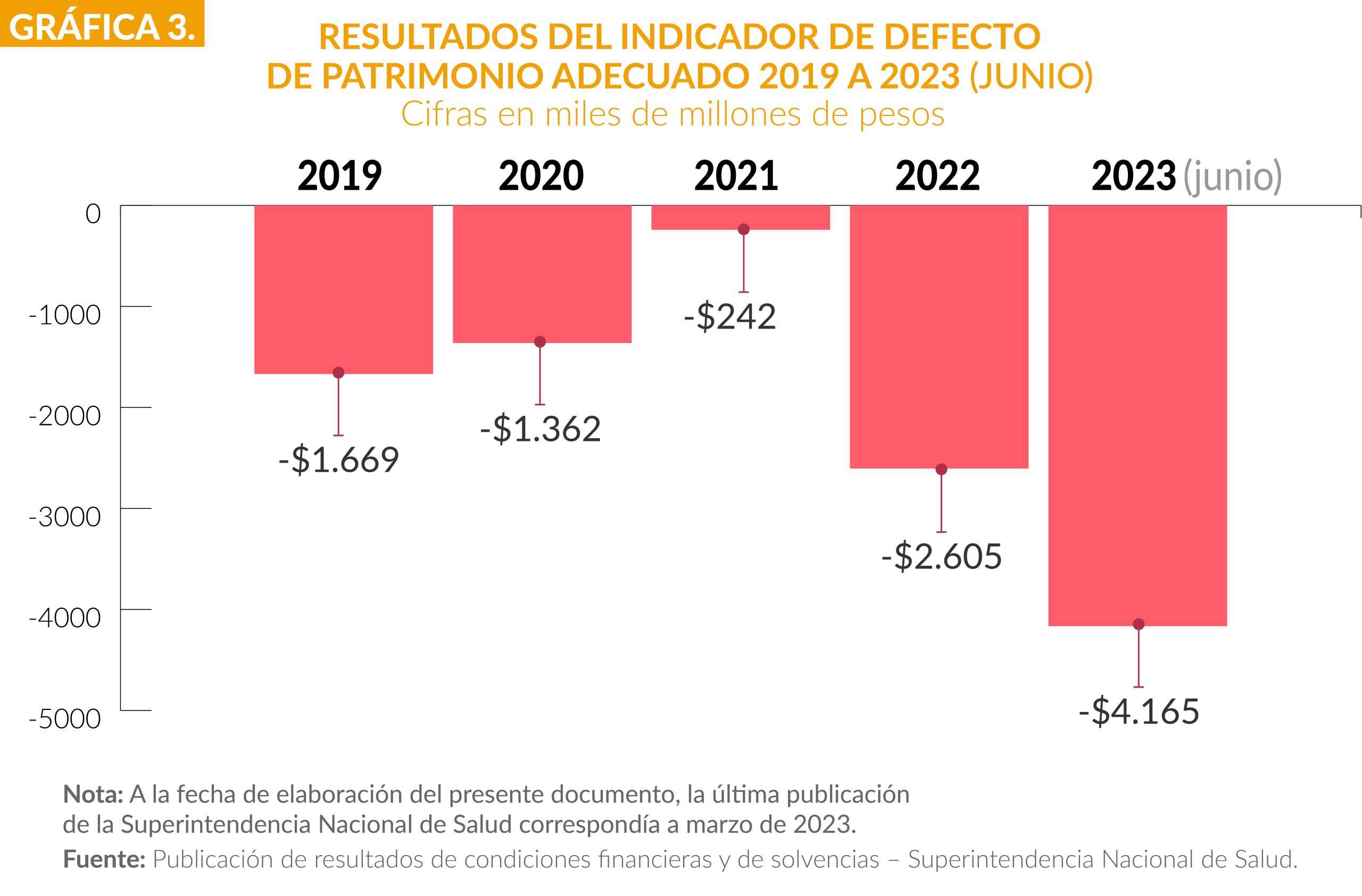 Como se observa en la gráfica anterior, el indicador presentó una sustancial mejora del indicador de patrimonio adecuado, pasando de -$ 1.3 billones a -$ 242 mil millones, equivalente a una mejorar del resultado del indicador del 82 %. Sin embargo, coincidente con las pérdidas (Gráfica 1) y con la situación patrimonial (Gráfica 2), el resultado del indicador de patrimonio adecuado tuvo una caída en la vigencia 2022 muy significativa, llegando a -$ 2.605 millones, equivalente a un aumento del defecto del indicador de patrimonio adecuado del 977 %. Este resultado, con corte a junio de 2023, ya se encuentra en -$ 4.165 millones, es decir, que en solo seis (6) meses, aumentó el déficit en un 60 %.