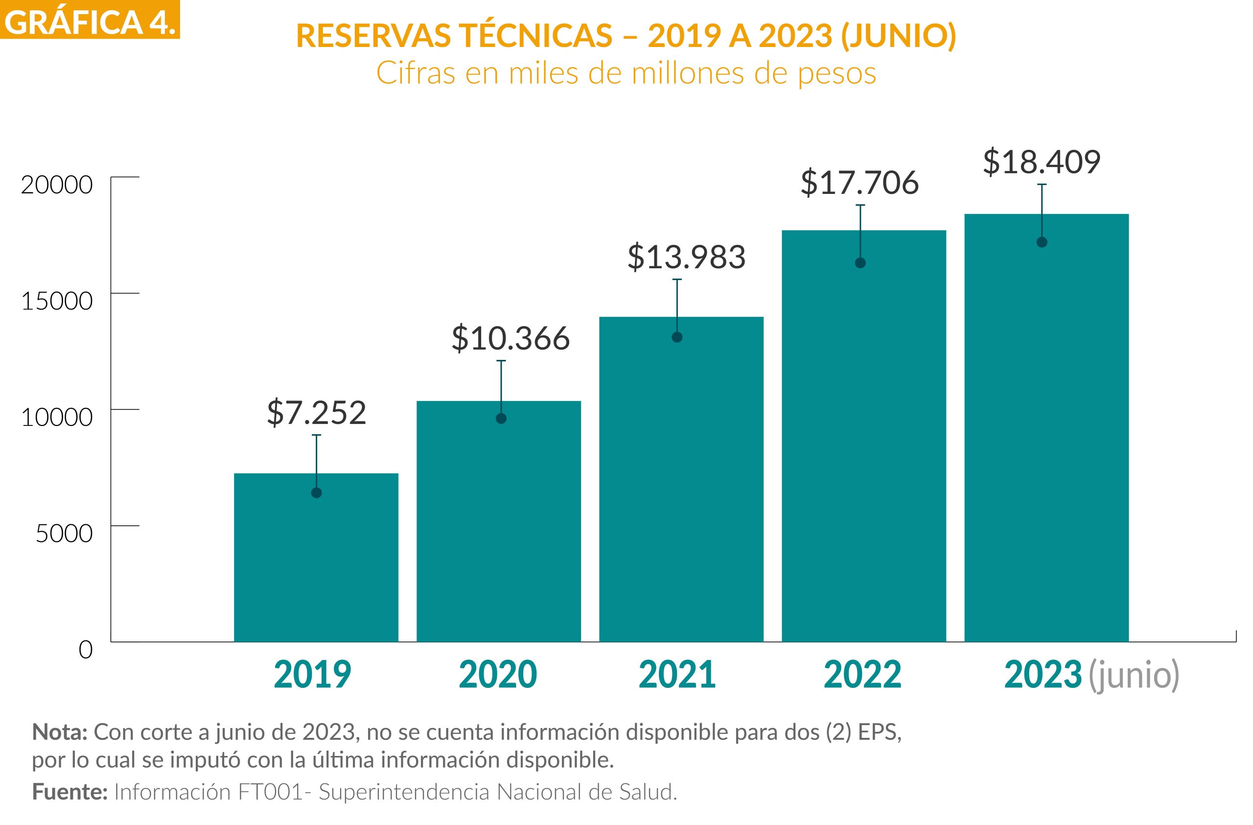 Las EPS, en aras de contrarrestar esta situación, han realizado un esfuerzo capitalizando las entidades. Entre 2019 y 2023 (junio). En agregado, han capitalizado $ 928 mil millones de pesos, con un esfuerzo significativo durante 2022, con unas capitalizaciones que alcanzaron los $ 324 mil millones. A pesar de lo anterior, las capitalizaciones han sido en los últimos dos años muy complicadas de materializarse, pues debido a la coyuntura que atraviesa nuestro sistema, en medio de una reforma estructural en la que se cambiará la operación de las EPS y parte de sus funciones, no va a ser posible pensar en dichas capitalizaciones, mucho menos para solventar las pérdidas de los dos últimos años que tienen identificadas unas causas externas a la función de las EPS.