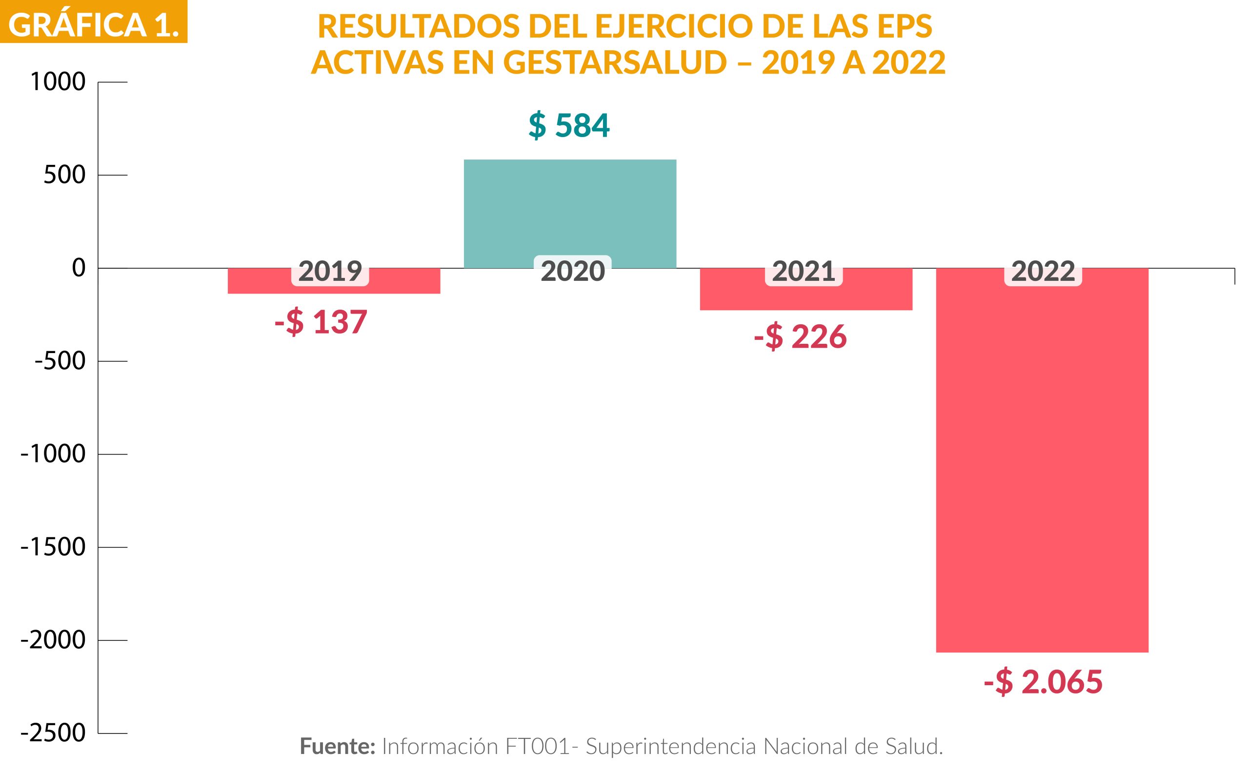 El año 2022 fue en términos financieros uno de los más complejos para las EPS que operan hoy en el país. Las pérdidas del ejercicio en las ocho EPS agremiadas y activas en Gestarsalud pasaron de $ 226 mil millones en el 2021 a más de $ 2 billones, equivalente a un aumento del 813 %, situación sin precedente en el Sistema General de Seguridad Social en Salud (Gráfica 1).